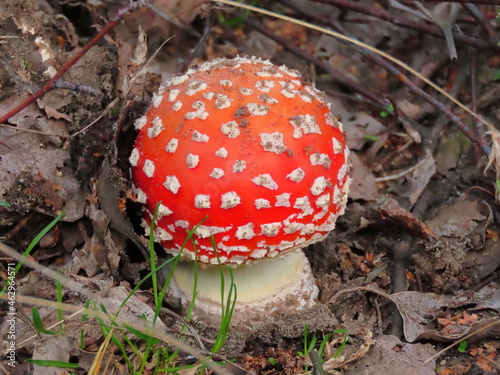 Beautiful red mushroom Amanita, in dry foliage in the forest in autumn in Ukraine close-up.