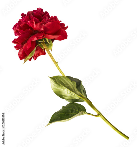 Beautiful Red Peony falling in the air isolated on white background. High resolution. Zero gravity or levitation concept.