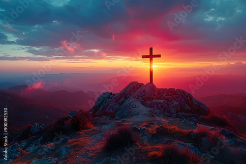 Beautiful red sunset scene with silhouette of a cross standing on a mountain hill