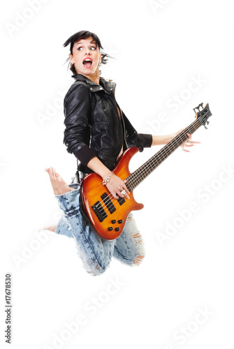 Beautiful rock-n-roll girl jumping with guitar isolated