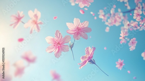 Beautiful romantic flying or levitate pastel flowers. Falling on bright blue background. Creative spring bloom or floral concept. Minimal natural Mother's, Valentines, Women's day or wedding day.