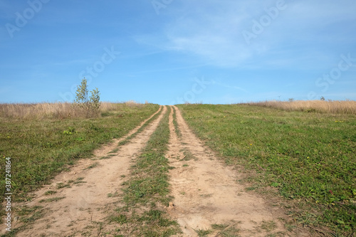 Beautiful rustic landscape with front view of ground road runs ahead through a green field under clear blue sky to horizon on sunny summer day