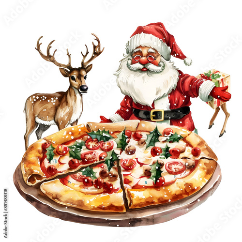Beautiful santa and reindeer Pizza, single object, watercolor illustration.