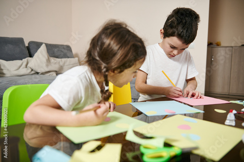 Beautiful school boy drawing while her little sister looking at his drawing image during art creativity class