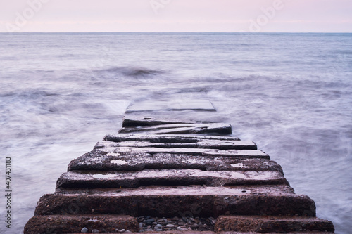 Beautiful sea landscape. Long stone sea pier breakwater goes deep into distance and waves break on it. Frozen photo using long shutter speed.
