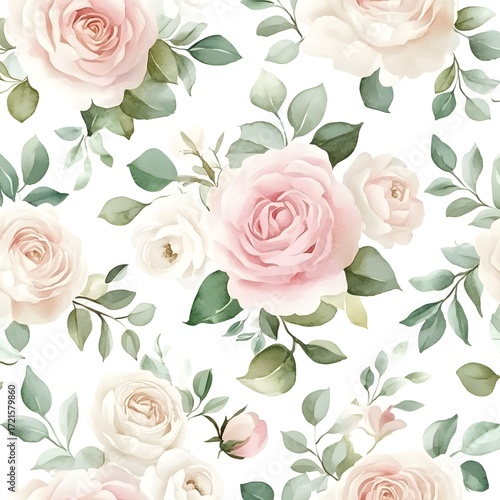 Beautiful seamless pattern displaying soft pink and white roses with delicate green leaves on white background.