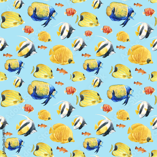 Beautiful seamless underwater pattern with cute watercolor colorful fish. Stock illustration.
