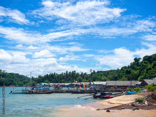 Beautiful seascape summer background. Scene of fisherman village with many local longtail boat on the sea and sky background on a sunny day in Thailand.
