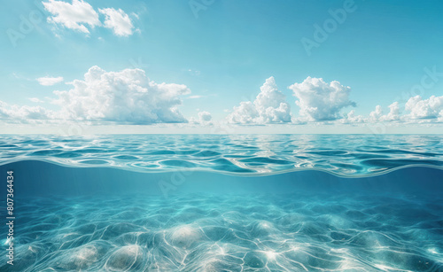 Beautiful seascape with blue sky and clouds reflected in water. View ocean dawn, warm sunlight horizon. Calm sea majestic, natural paradise. Beauty nature scenery.