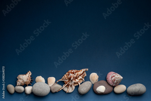beautiful seashells of different sizes blue background with place for text