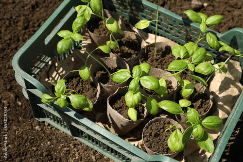 Beautiful seedlings in crate on ground outdoors