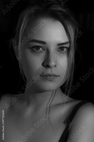 Beautiful sensual blonde girl. Close-up of an attractive girl of European appearance on dark background.