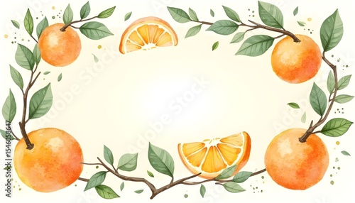 Beautiful set with watercolor fresh oranges with leaves in sunny Mediterranean style.