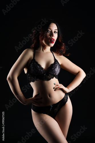 Beautiful sexy woman in lingerie posing on black studio background, low key studio shot