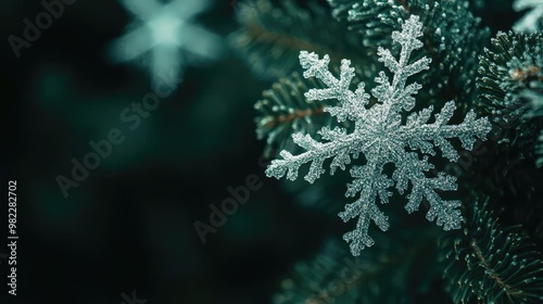 Beautiful, shimmering snowflake resting on evergreen branches, capturing the essence of winter and the magic of the holiday season.