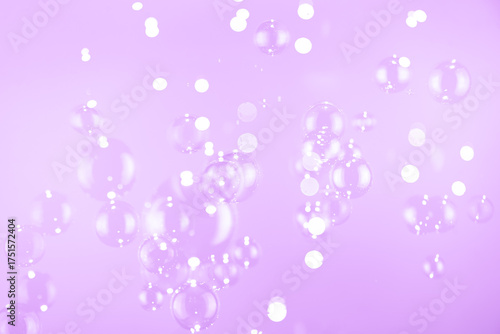 Beautiful Shiny Purple Soap Bubbles Floating in The Air. Purple and White Gradient Textured. Celebration Festive Backdrop. Freshness Soap Suds Bubbles Water.