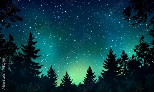 Beautiful Sky with Aurora and Stars. Green Northern Lights Wallpaper with copy-space.
