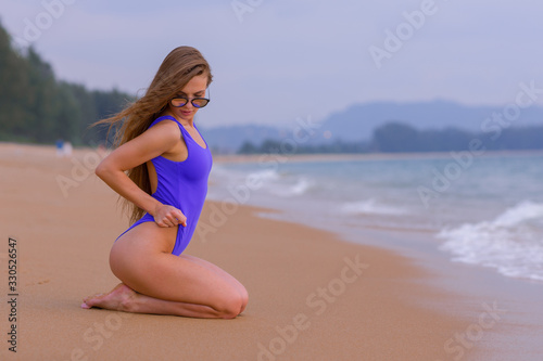 Beautiful slim girl in a blue swimsuit on the ocean.