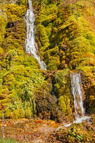 Beautiful small waterfall on the background of green moss. Summer sunny weather