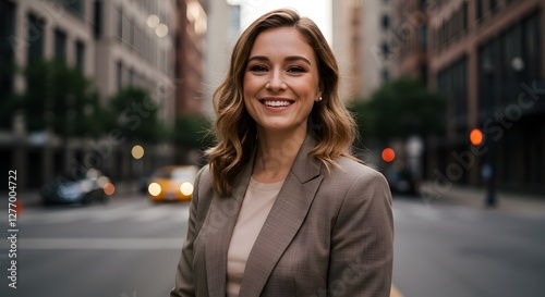 beautiful smile woman wearing a business suit, standing in the city, sunshine, with a little bit of blurred background with copy space