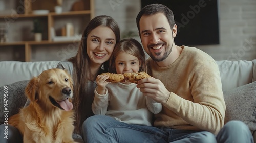 Beautiful smiling family happy mother father and cute daughter eating cookies looking at camera sitting on comfortable sofa with pet golden retriever Concept of parenthood love : Generative AI