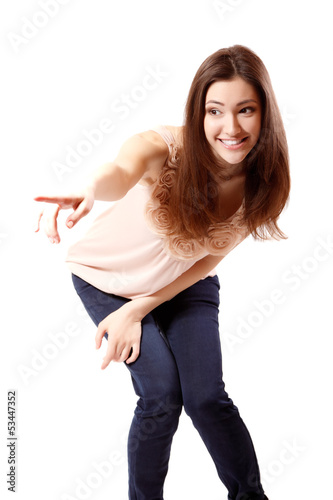 beautiful smiling girl happy ecstatic gesturing surprise and sho