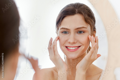 Beautiful smiling woman looking at mirror, applying eye serum, anti-aging beauty products concept
