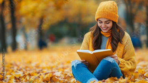 Beautiful smiling young woman student sitting and reading book at autumn park fall yellow foliage leaves. Concept of enjoying nature