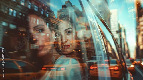 beautiful smiling young woman traveling by yellow taxi car , looking through the window with reflection in the glass. Female happy in car while traveling on road to destination. View through. trip