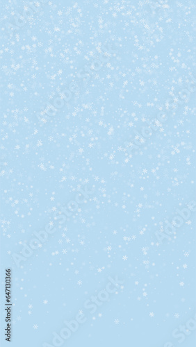 Beautiful snowfall christmas background. Subtle flying snow flakes and stars on light blue winter backdrop. Beautiful snowfall overlay template. Vertical vector illustration.