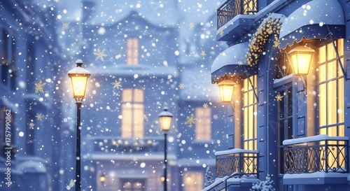 Beautiful snowy winter street with lights and decorations, warm festive atmosphere for Christmas and New Year greeting design.