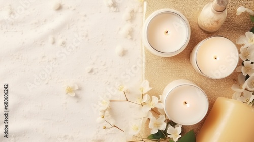 Beautiful spa treatment composition such as Towels, candles, essential oils, Massage Stones on light wooden background. blur living room, natural creams and moisturizing Healthy lifestyle, body care