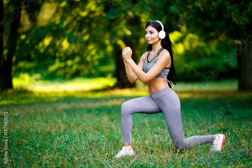 Beautiful sport fitness girl in sportswear doing fitness exercise in the park.
