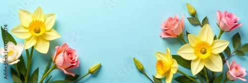 Beautiful spring bouquet with roses, daffodils, and lilies on a pastel blue backdrop, background, pastel_blue, bouquet
