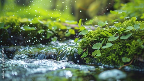 Beautiful Spring Detailed Close Up Stream of Fresh Water with Young Green Plants. Banner, Springtime, Outdoor, Wild, Nature, Background, Plant, Flow, Flowing, Scenery, Ecology