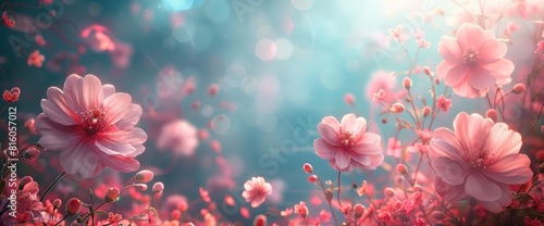 Beautiful Spring Flowers Flying In The Air Against A Teal Background, Creative Spring Concept, Birthday Background