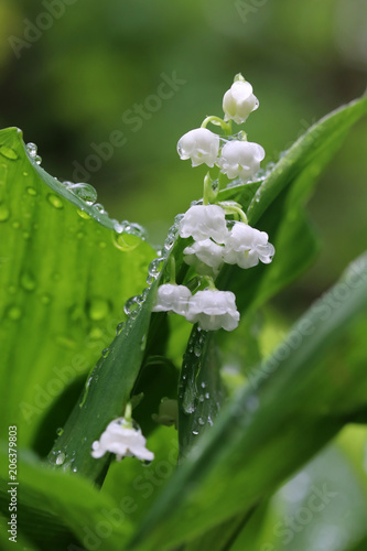 Beautiful springtime nature background. Blooming lily of the valley in a spring forest in a water drops after rain close up on a shallow depth of field bokeh background. Freshness and purity concept.
