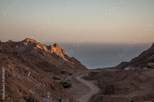 Beautiful stone mountains in the desert. Yellow sand on the mountains. Evening nature. Sunny summer day.