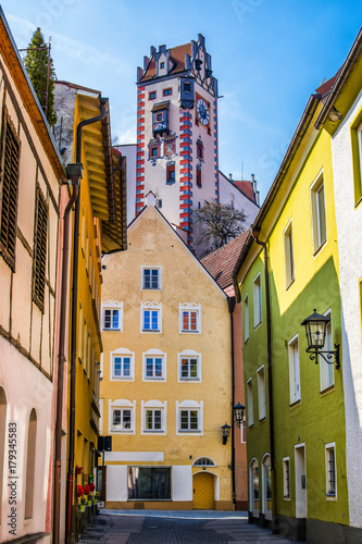 Beautiful street of old houses with the tower of the High Castle, Fussen city, Germany