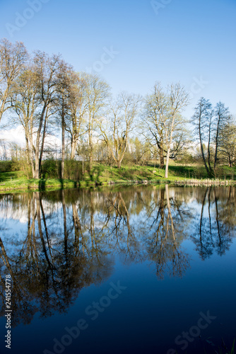 beautiful summer day at the lake, tree reflections in blue water