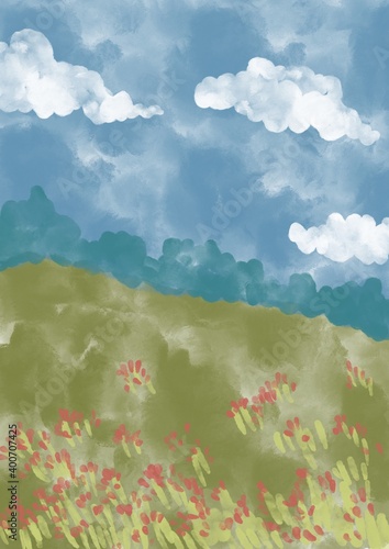 Beautiful summer landscape. A field of flowers and hills. Digital painting. Cute illustration for the decor and design of posters, postcards, prints, stickers, invitations, textiles and stationery.