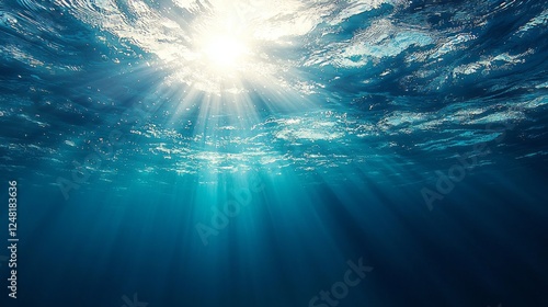 Beautiful sunlight streams down through the tranquil blue water surface, illuminating air bubbles as they rise. This captivating water scene is perfect for design and nature lovers