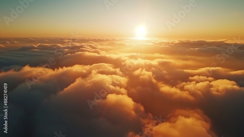Beautiful sunrise and sunset above the clouds, with the sun shining through them. Aerial view down on a golden sky and white fluffy clouds at sunset or sunrise. Beautiful natural background.
