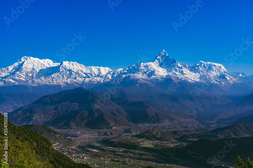 Beautiful sunrise view of mountain range with snowy peaks. Annapurna range in Himalayas. Machchapuchchre/ Fishtail, Annapurna and Himchuli Peaks, view from Sarangkot, Pokhara, Nepal.