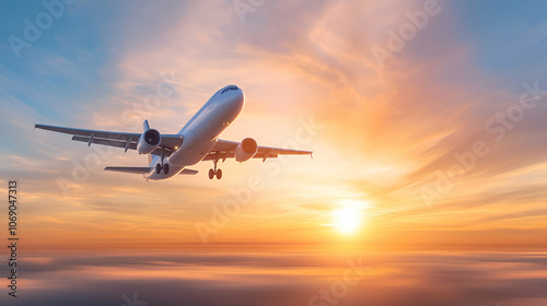 Beautiful sunset and cloudy sky from an aerial view. Airplane view above clouds