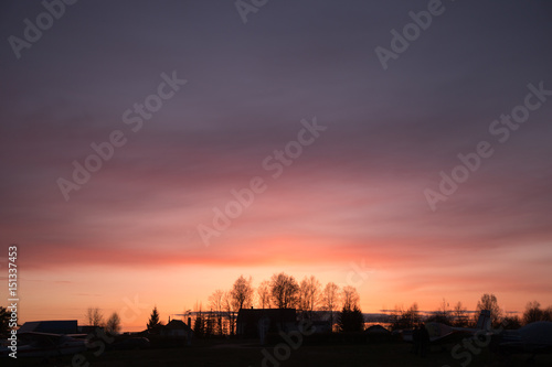 Beautiful sunset at the airfield with blurred clouds and silhouettes of trees and buildings