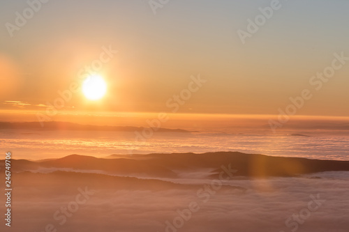 Beautiful sunset over a valley filled by fog with mountains and hills