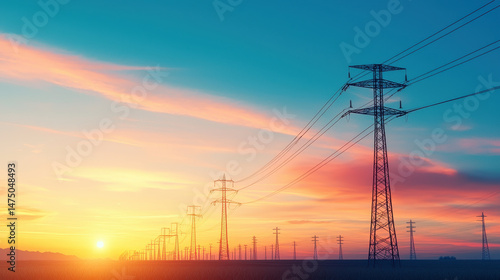 Beautiful sunset over landscape with power lines silhouetted against colorful sky, creating serene and tranquil atmosphere