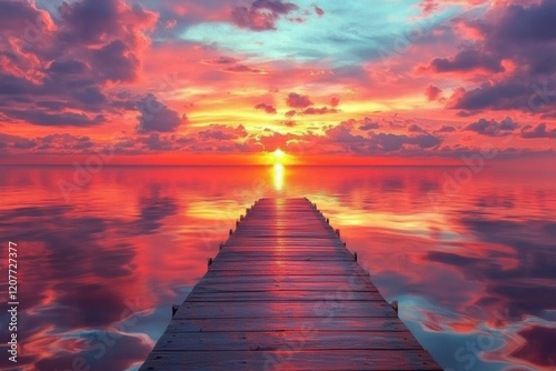 Beautiful sunset over tranquil waters with a wooden pier creating a serene atmosphere