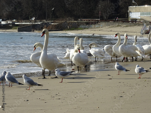 Beautiful swans birds during sunset in Black sea at Varna - BG